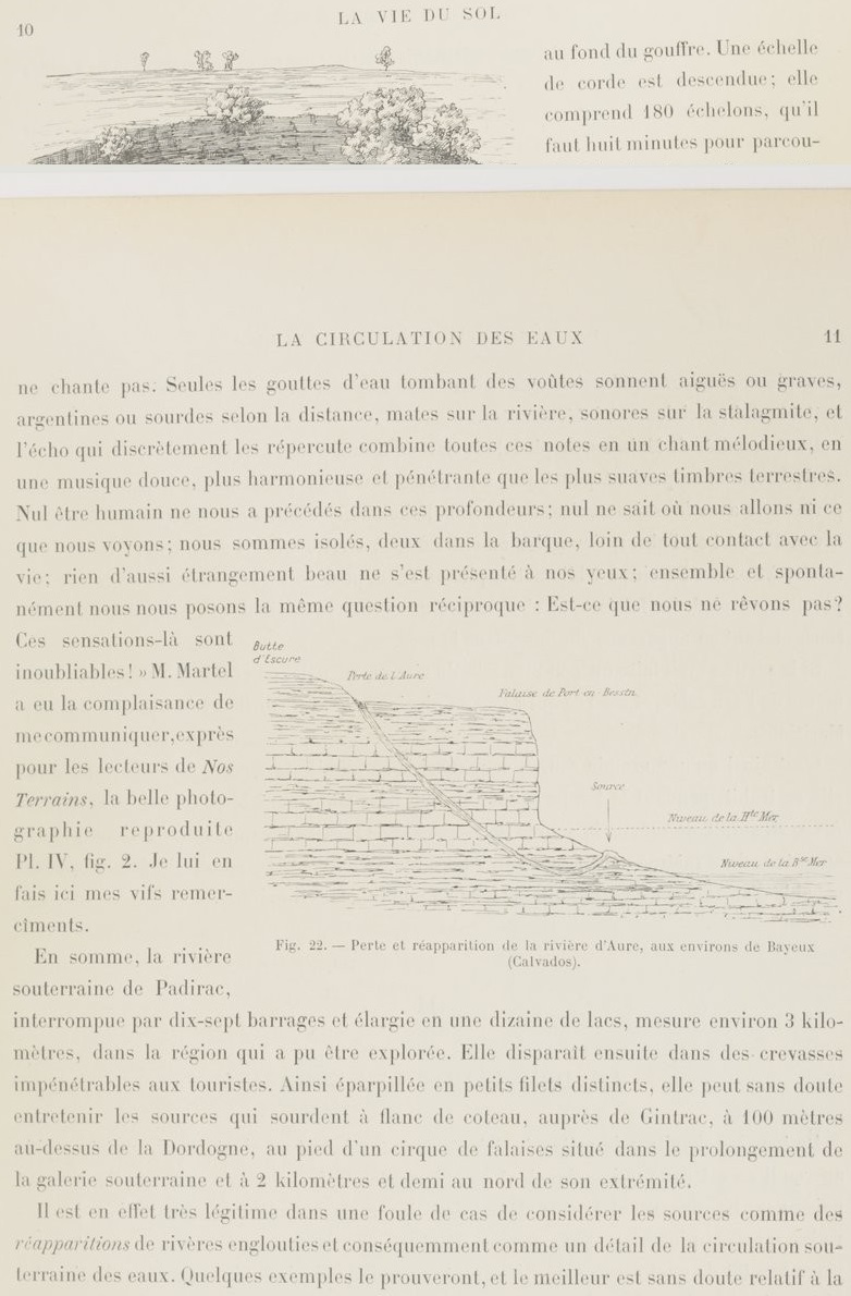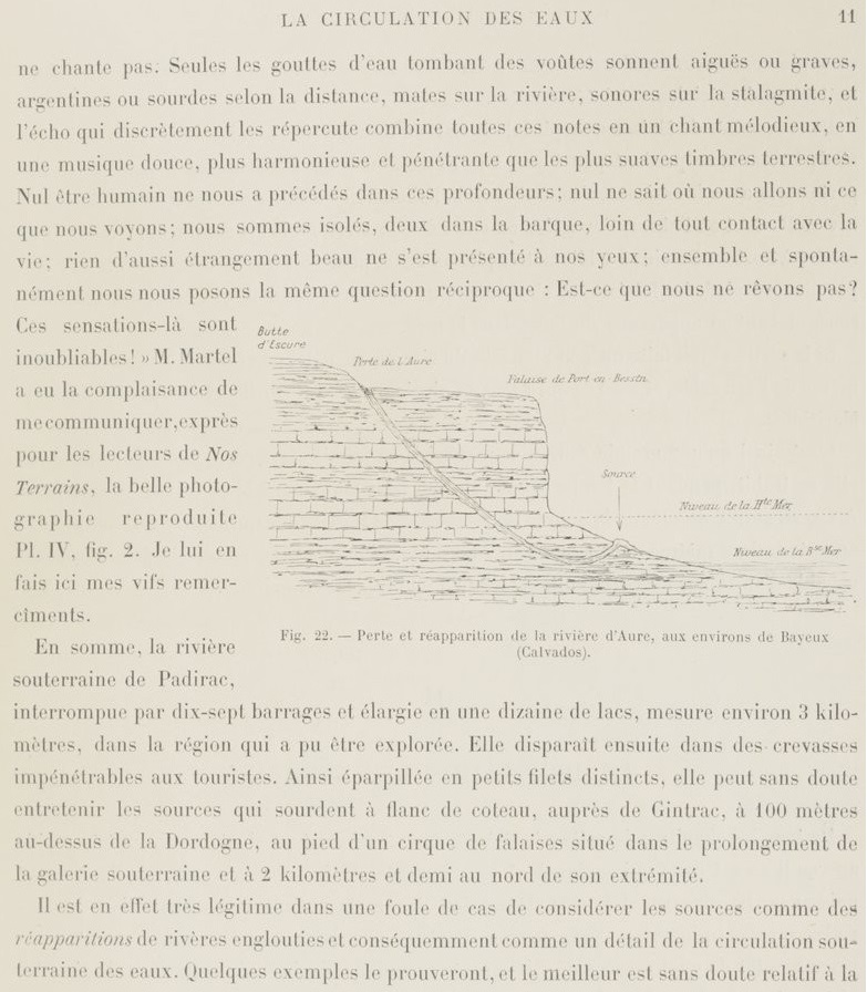 Dans Gallica, j’ai trouvé le livre de Stanislas Meunier qui contient l’un des récits d’exploration et résume les connaissances d’alors (1898) surtout vu du côté des résurgences. De nos jours, s’il existe une communication de l’eau vers les sources de Gintrac, il est bien connu que c’est la fontaine Saint-George, située au-dessous du village de Montvalent qui constitue la résurgence principale. Montvalent est aussi une commune (paroisse plutôt) très liée à l’histoire de mes ancêtres.