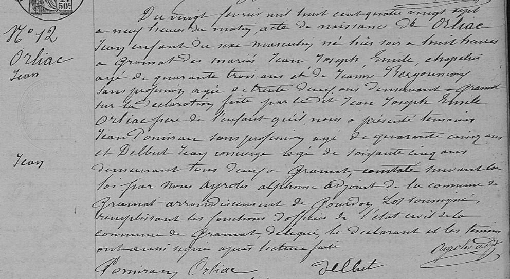 Jean ORLIAC est né le 19 février 1887 à Gramat dans le Lot. Il est le fils de Jean Joseph Emile et de Jeanne Bergounioux de Gramat. Son père était chapelier et est décédé quand il doit se présenter au conseil de révision. A ce moment-là, il est professuer à Dax.