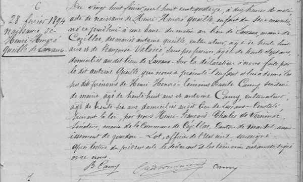 QUEILLE Henri Honoré : né le 28-02-1894 à Cazillac (46), classe 1914, matricule n° 526, unité : 139e régiment d’infanterie (139e RI), soldat, mort le 6727 à Ferté-Milon (La) [Mosloy], 02 - Aisne - France, décès retranscrit à Cazillac, 46 - Lot, France.