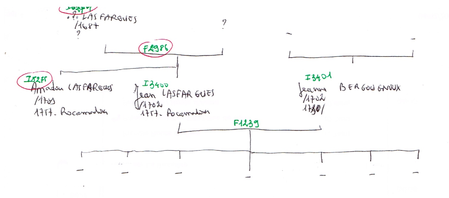 Jean-Pierre DABADIE (jpdabadie sur Geneanet) en a trouvé huit : Jean, Jean (4356), Antoine (4352), Toinette, Toinette (2222), Amadour (2216), Marque (2545) et Jean. Il me faut donc ajouter Jean, l’aîné, Toinette n°1 et Jean le benjamin. Trois frères avec le même prénom ! Pas si rare que ça à l’époque, en tout cas dans ma famille. Pour tout simplifier, dans l’arbre des MaLiBeLe, j’ai quarante personnes dénommées Jean LASFARGUES. Heureusement six d’entre lles ont un autre prénom (prénom composé peut-être mais pas certains). Il en reste donc trente-quatre ! Parmi elles cinq sont des ancêtres directs (sosa) des MaLiBeLe et dix sont des "cousins généalogiques".