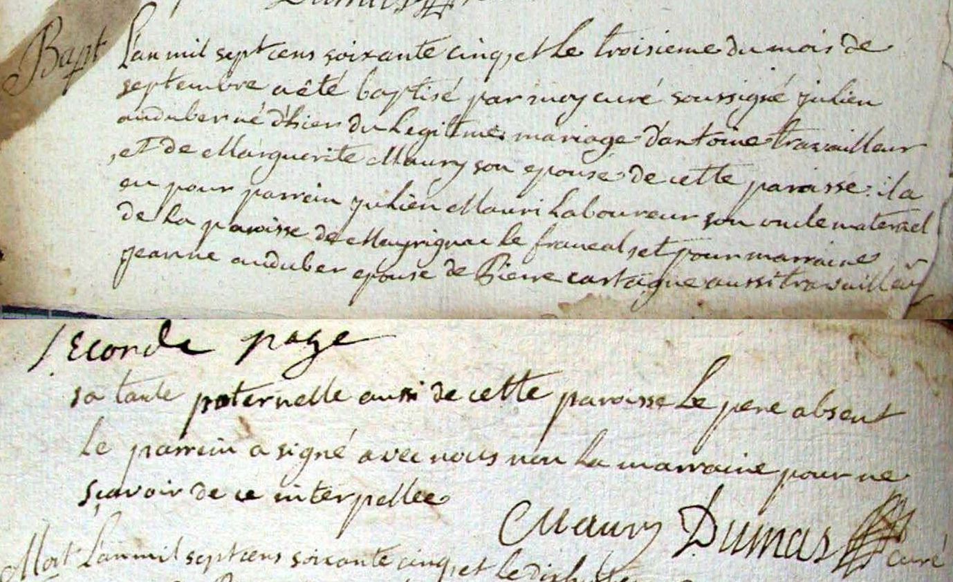 Avec cette lecture plus attentive que les précédentes aux détails et le feuilletage de soixante-douze pages manuscrites du registre des actes religieux de la paroisse, je trouve le baptême de AUDUBERT Julien ( Consulter la fiche média ). La marraine est : " Jeanne AUDUBER épouse de Pierre Castagné travailleur tante paternelle aussi de cette paroisse".