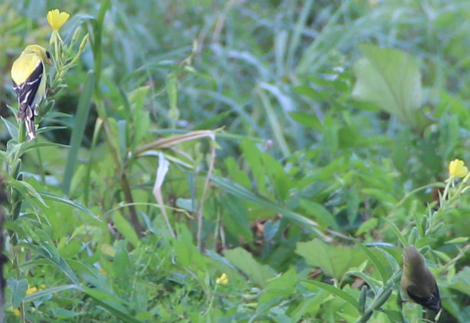 Il n’est jamais facile de photographier des oiseaux surtout s’ils sont de petites tailles. En voir deux, peut-être un couple, dont un aux couleurs chatoyantes ravit autant Cyclotin que Cyclotine. C’est sûrement un chardonneret jaune.