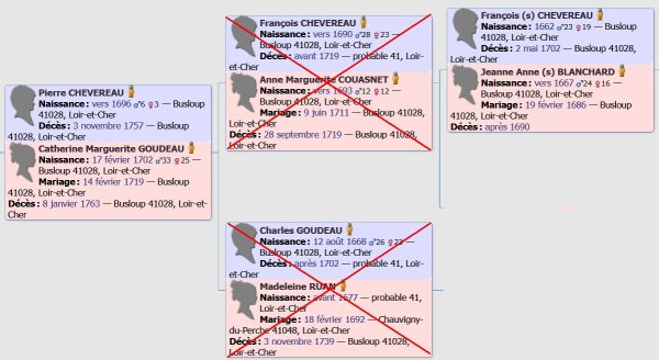 A priori, c’est une fiche ordinaire si ce n’est deux sources sur le web mais qui n’existent plus ! Il s’agit de benevolat41 et de Geneaplaut. Vu l’ancienneté de la saisie, je tente une recherche sur geneanet.org. Et là... !? Les "Pierre CHEVEREAU" à Busloup dans le Loir-et-Cher pullulent. Enfin, il y a beaucoup d’arbres qui ont au moins un Pierre CHEVEREAU dans leur arbre. Avec un peu d’étonnement, je découvre que les parents ne sont jamais ceux qui lui sont affectés dans l’arbre des MaLiBeLe ! Le père semble toujours être François mais la mère est le plus souvent Jeanne BLANCHARD alors que c’est Anne Marguerite COUASNET ( Consulter la fiche individuelle ) qui figure dans l’arbre des MaLiBeLe (Jeanne y figure bien mais comme la grand-mère paternelle de Pierre).