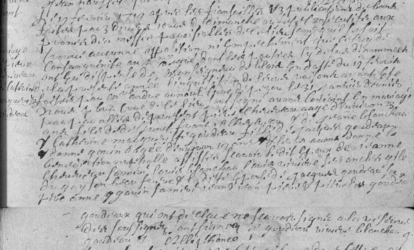 Donc, j’ai fait une erreur. Les parents de Pierre ( Consulter la fiche individuelle ) sont François et Jeanne Blanchard et non François et Anne Marguerite COUASNET. Continuons de déchiffrer l’acte avant d’entamer les corrections dans l’arbre des MaLiBeLe . Mais...!!!??? Les parents de Catherine Marguerite GOUDEAU ( Consulter la fiche individuelle ), l’épouse de Pierre, ne sont pas Charles et Madeleine RUAN !
