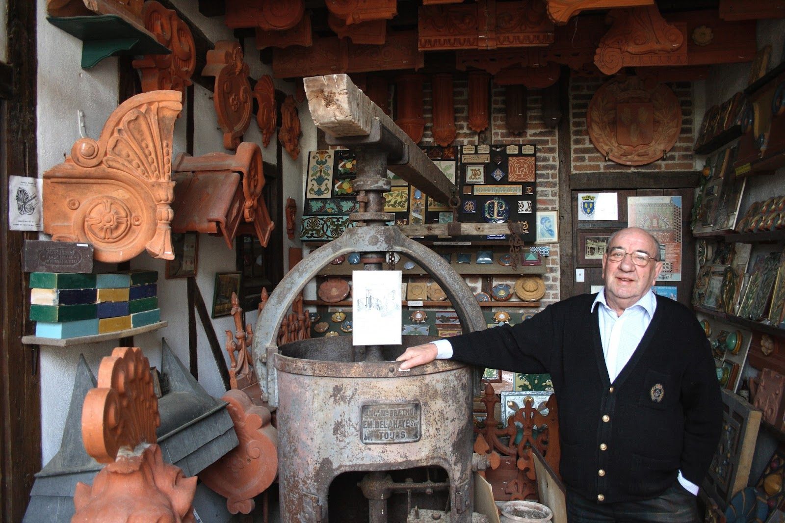 Arrivé à la retraite, Michel a pu commencer à trier ses briques et à les installer chez lui dans des présentoirs adaptés. Cela lui a permis de faire visiter sa collection à ses amis ou à des groupes (associations, etc.) pour des visites guidées auxquelles je participais. C’est à cette époque qu’il a élargi le champ de sa collection, en s’intéressant aux objets de décoration intérieure et extérieure en céramique, et à réunir une très importante documentation (historique, technique…) qui constitue une mémoire unique de cette industrie.