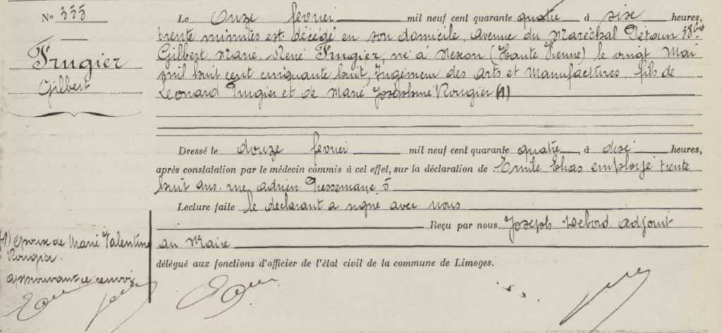 René FRUGIER décède le 11 fevrier 1944 à 85 ans. On notera que l’acte de décès utilise son prénom officiel « Gilbert » et non le prénon usuel « René » :
