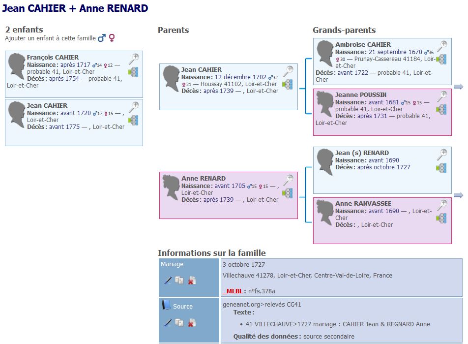 local : Consulter la fiche familiale n°F781. ) , je m’appuie sur un relevé du CG41. - Pour le père, Jean CAHIER, il s’agit toujours du CG41 pour le baptême et deux arbres en ligne (ceux de Damien Lhomme et de Pascal Leroy).