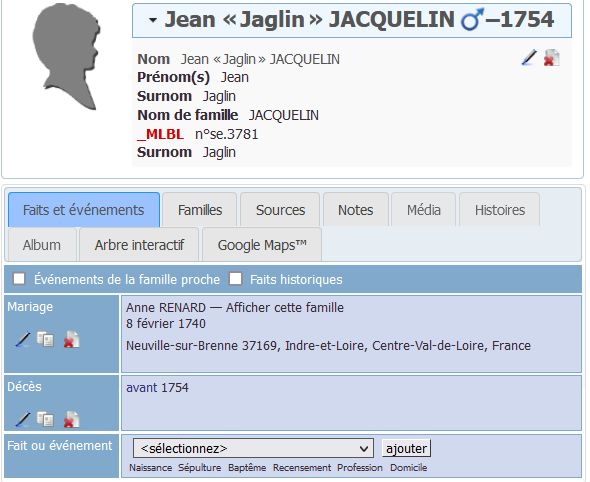 Si j’en crois Nicolas et la fiche individuelle qu’il a réalisée sur le couple, Jean JAGLIN JACQUELIN se serait marié le 8 février 1740 à Neuville-sur-Brenne. L’acte de mariage ne s’avère pas trop difficile à trouver. En voulant passer sur la fiche de Jean JAGLIN depuis celle de Marie JAHAN, je suis surpris de ne pas voir afficher Jean "Jaglin" JACQUELIN mais de lire Jean JAGLIN. Qu’est-ce que c’est que ça ? La réponse est vite évidente : il y a deux fiches différentes ! La réponse à la question initiale est enfin là : c’est l’un des deux mais ce n’est pas le mari de Anne RENARD. Il faut donc supprimer le lien ainsi créé et fusionner alors les deux fiches Jean "Jaglin" ou Jean JAGLIN.