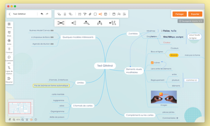GitMind, est un outil 100% en ligne, 100% gratuit, qui permet de faire des cartes mentales et des diagrammes. Chose rare, il parle français, et propose une bibliothèque de modèles très complète, avec des modèles en français.