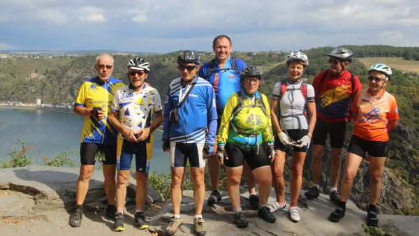 Presque tout le groupe des grimpeurs...Roland BouatLes paysages sont somptueux depuis la piste cyclable qui longe le Rhin mais trop plat pour quelques-uns qui décident de monter jusqu’au point de vue sur le Rocher de la Loreley et la vallée du Rhin. Trois kilomètres d’effort pour être récompensés d’un magnifique point de vue. La descente se fera très rapidement sur une pente qui doit certainement approcher les quinze pour cent dans certains passages. Le groupe se reforme à Sankt-Goar.