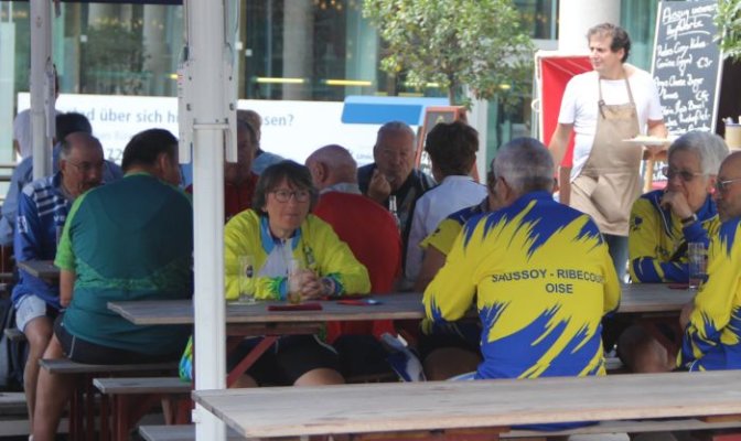 A Rudesheim, une surprise nous attend : les vélos sont arrivés à l’hôtel mais la gare est de l’autre côté de la ville et du Rhin. Nous allons devoir marcher un peu et prendre un bac pour traverser. Heureusement, le paysage environnant est superbe. Nous croiserons même des ouettes peu sauvages. Autre surprise, l’hôtel est en haut de la ville et certains devront monter les valises sur deux étages... dans un autre bâtiment ! Pendant ce temps, que font nos guides ? Ils trinquent !