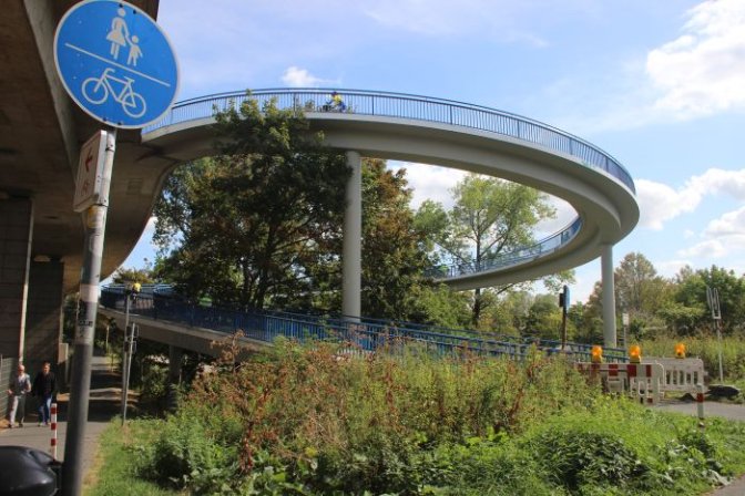 Bonn nous accueille avec un pignon de maison peint en l’honneur de Beethoven qui est né ici. Cette fois-ci, nous ne traverserons pas le Rhin par un bac mais, pour prendre le pont, nous empruntons une piste cyclable en hélice qui permet d’y accéder : ce sera "la forte pente du jour" !