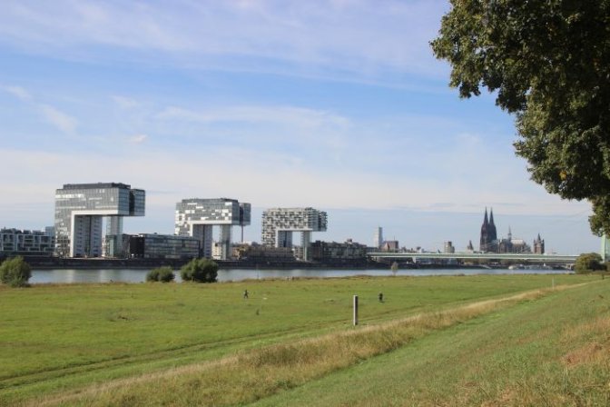 Contraste étonnant à l’arrivée à KölnRoland BouatL’arrivée à Cologne (ici, la ville s’appelle Köln), est facile à reconnaître avec ses contrastes dans les bâtiments. Nous y reviendrons manger ce soir dans la vieille ville près de la cathédrale. Plusieurs d’entre nous choississent le "jarret de porc". Mais attention, la part (c’est bien indiqué dans le menu) ne pèse que 1,7 kg ! Vous avez bien lu mille sept cents grammes...