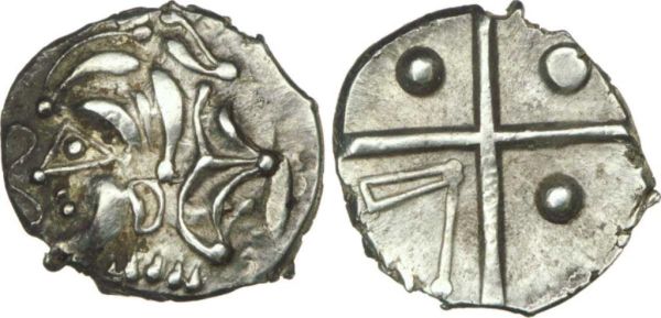 Drachme à la tête triangulaire frappé par les Cadurques. Date : IIe siècle av. J.-C. ; Description avers : Tête triangulaire à gauche ; le nez figuré par un triangle, avec un point cerclé en guise d’œil ; le tout dans un entourage de bâtonnets et arcs de cercles bouletés et liés ; un collier de perles à la base du cou et un fleuron devant le visage.On ne sait finalement qu’assez peu de choses des Cadurques, tribu celte installée sur le territoire quercinois, qui couvrait l’actuel département du Lot et le nord de celui du Tarn-et-Garonne. On leur doit nombre de forteresses, appelées oppida, comme Murcens, l’Impernal, Capdenac, les Césarines, Béars, le Puy-d’Issolud, le Roc de Colonjat, etc., dont il ne reste souvent, il est vrai, que quelques vestiges ; ils sont néanmoins bien visibles et l’on peut s’y promener en se laissant aller à imaginer la vie qui régnait jadis en ces lieux qui, tous situés sur de hautes collines bordées de falaises, sont écrasés de soleil en été et balayés par les vents froids en hiver.