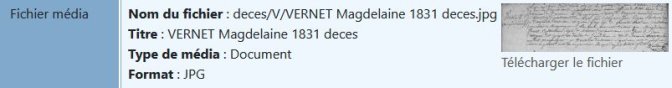 L’acte de décèsLa vérification en cours de l’arbre généalogique tente de récupérer les actes de décès manquants à propos des ancêtres. Les actes de décès des personnes non ancêtres sont enregistrées mais pas nécessairement en tant qu’objet média.