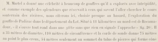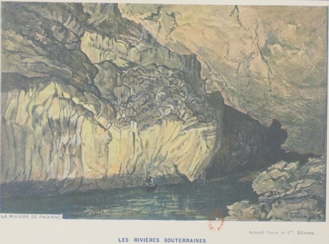 Dans Gallica, j’ai trouvé le livre de Stanislas Meunier qui contient l’un des récits d’exploration et résume les connaissances d’alors (1898) surtout vu du côté des résurgences. De nos jours, s’il existe une communication de l’eau vers les sources de Gintrac, il est bien connu que c’est la fontaine Saint-George, située au-dessous du village de Montvalent qui constitue la résurgence principale. Montvalent est aussi une commune (paroisse plutôt) très liée à l’histoire de mes ancêtres.