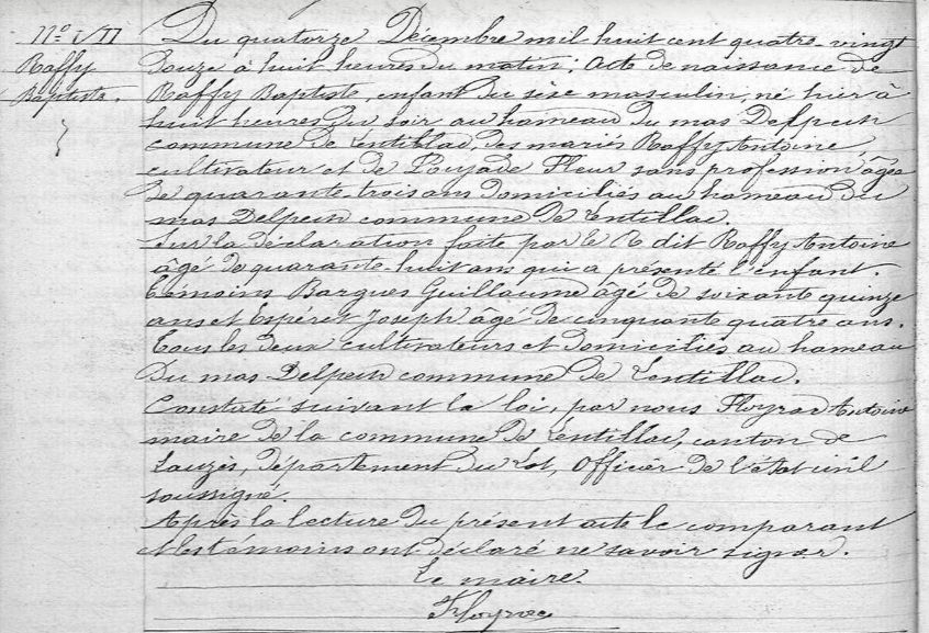 Baptiste RAFFY est né le 13 décembre 1892 au Mas Delpech à Lentillac (maintenant Lentillac-du-Causse) près de Lauzès dans le Lot. Il est le fils de Antoine Raffy et de Fleur Poujade de Blars près de Lauzès. Au conseil de révision, il était maçon à Blars, son père est déjà décédé.