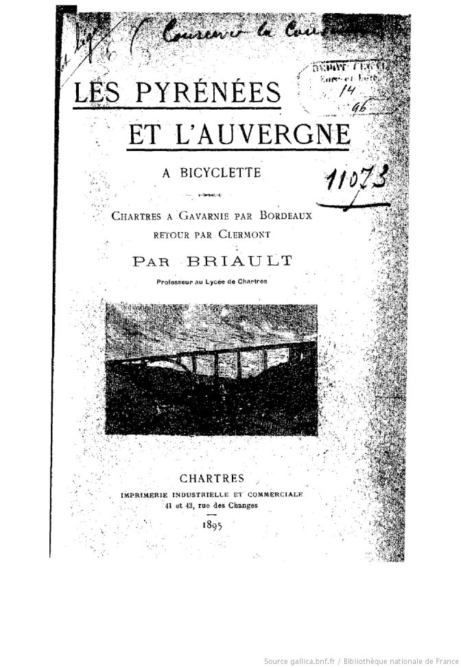 Les Pyrénées et l’Auvergne à bicyclette : Chartres à Gavarnie par Bordeaux, retour par Clermont, Briault (18..-19..? ; professeur au lycée de Chartres), Éditeur : Impr. industrielle et commerciale (Chartres), 279 pages, 1895 => consultation en ligne, publié le 15/10/2007, consulté le 01/04/2016.Voici l’itinéraire qu’il s’était donné pour les trois semaines dont il disposait (page 4) : "Chartres à Gavarnie, par Poitiers, Bordeaux-Tarbes, avec retour par Toulouse, Figeac-Aurillac, Clermont et Limoges". Avec comme première étape Chartres-Poitiers qu’il "voulait franchir rapidement" parce qu’il connaissait la route "dans tous ses détails".