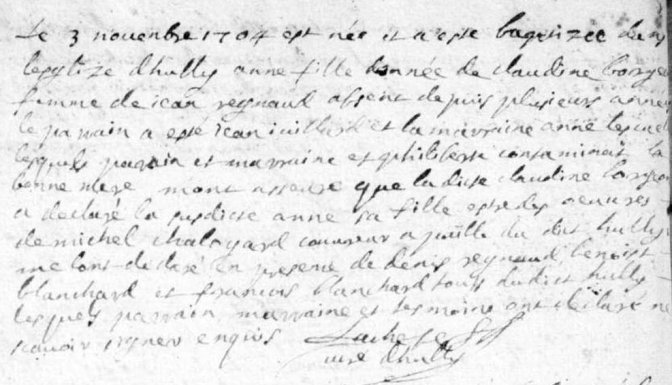 Le 3 novembre 1704 est née et a esté baptizée dans leglize dhuilly anne fille donnée de claudine borgeon femme de jean regnaud absent depuis plusieurs années le parrain a esté jean juillard et la marraine anne lescuelle lesquels parrain et marraine et philiberte contaminat la bonne mere m’ont assure que la dicte claudine borgeon a declaré la susdite anne sa fille a este des oeuvres de michel chaloyard couvreur a paille du dit huilly [...] en presence de denis reganud benoist blanchard et francois blanchard touss dudit huilly lesquels parrin marrine et tesmoins ont declaré ne savoir signer enquis
