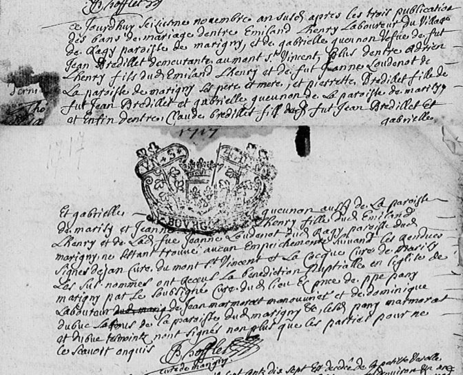 Découverte de deux Emiland LHENRY dans l’arbre généalogique des MaLiBeLe MaLiBeLe La généalogie telle que je la vois à travers l’arbre généalogique de mes petits enfants. : d’une part Emiland LHENRY né vers 1661 en Saône-et-Loire, décédé en 1727 et marié avec Gabrielle GEUNION en 1717 à Marigny, d’autre part Emiland LHENRY né avant 1687 en Saône-et-Loire, décédé après 1717 en Saône-et-Loire et marié avec Jeanne LOUDENOT (décédée avant 1717) avant 1702 en Saône-et-Loire. La question est donc posée : Y a-t-il homonymie ou une seule personne ?