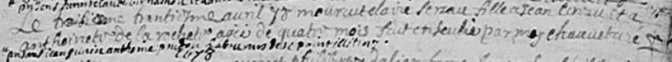 "Le trentième avril 78 mourut claire Cirau fille a Jean Cirau et a anthoinette de la rochette agée de quatre mois fut ensevelie par moy chaunet () curé present ican guinin anthoine prudon laboureurs de stpoint illetres."