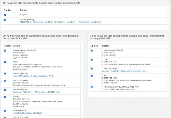 Commençons par les fiches de Jacques PASQUIER et par désélectionner les faits et évènements de Jacques PASQUE puisque tout est déjà contenu dans la fiche de Jacques PASQUIER (il y a même plein de sources adjointes).