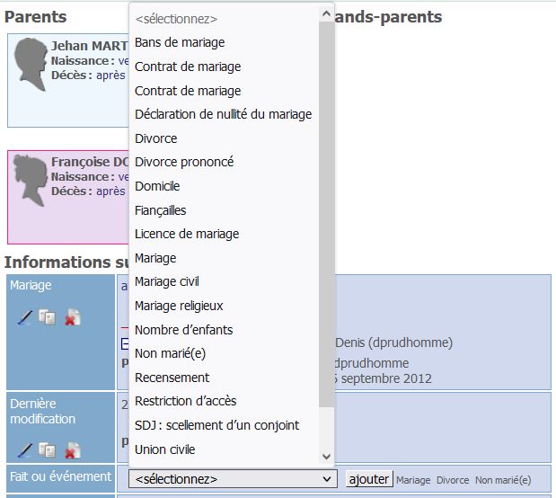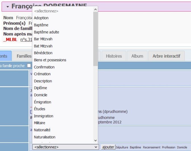 Balise personnalisée / Baptême / Cas général / Date / Décès / Gedcom / Histoire d’une personne / Identité / Inhumation / Lieu / Mariage / Média / Naissance / Nom / Nom de famille après mariage / Note partagée / Note simple / Prénoms / Sépulture / Source / Surnoms