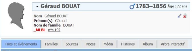 Dans l’arbre en ligne des MaLiBeLe , une seule balise personnalisée (c’est déjà une de trop mais ainsi mes annotations perso n’apparaissent pas lors du transfert du gedcom) est utilisée afin d’indiquer la numérotation "sosa modifiée" [6]. Elle s’appelle _MLBL et son contenu commence toujours par "n°s". Exemple : -MLBL n°s.12 (c’est le sosa n°12 des MaLiBeLe ).