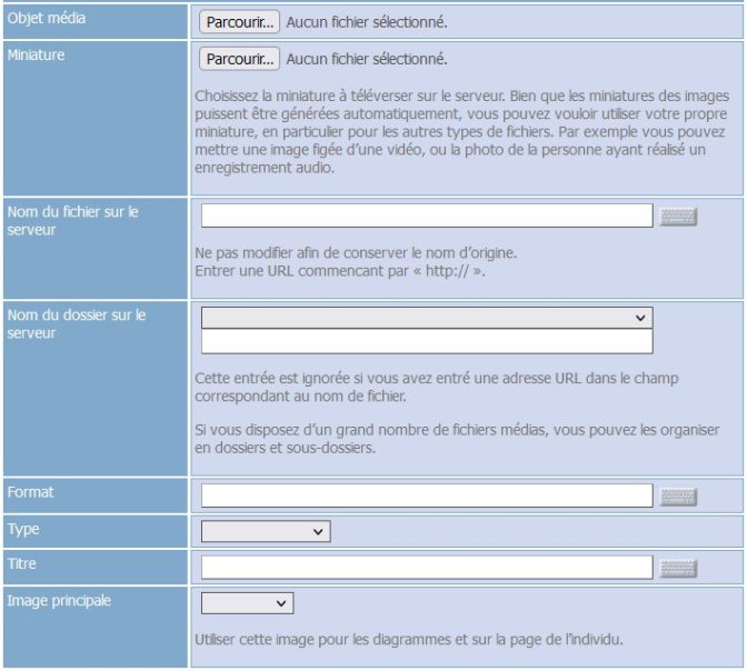 Un média est un document [12] le plus souvent sous forme d’un fichier. Une copie sera stockée dans le dossier /medias de webtrees et c’est cette copie qui sera utilisée. Il ne s’agit donc pas de la saisie du média en lui-même mais du fichier correspondant.