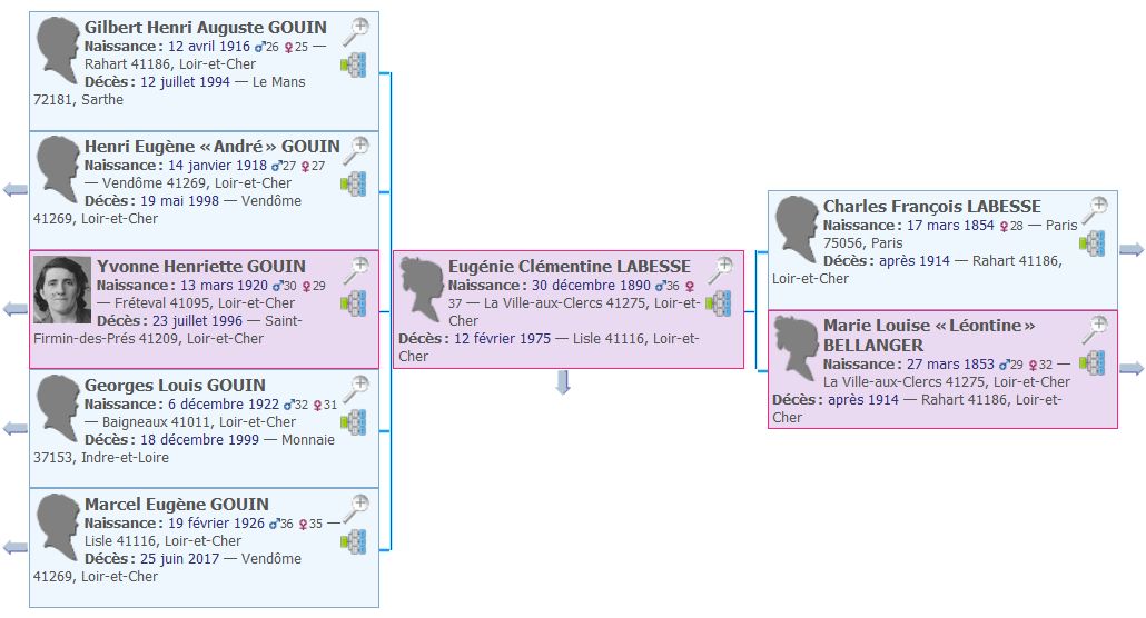- 1963 : Décès [ref] de son frère Elie François Auguste LABESSE [36] le 19 mars à Vendôme. Eugénie a 73 ans.