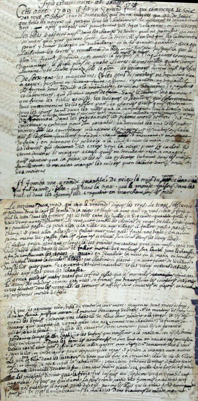 "Cette année 1709, il fit un si grand froid qui commança le soir des roys 6 janvier jour de dimanche, qui dura iusques au 22 de janvier, que tous les noyers et presque tous les chataigners se gelerent et devindrent secs, après quelques uns pousserent des tiges de la racine ou sur les corps.