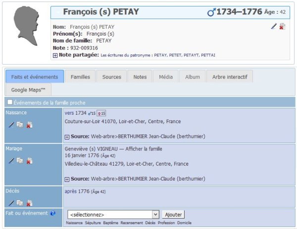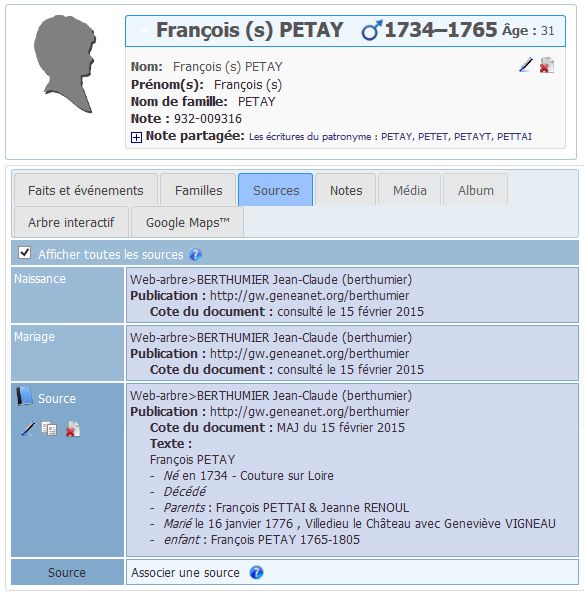 En termes de norme gedcom, cela signifie qu’il existe une entrée pour la Source et qu’à l’évènement est associé le n° de la source suivi