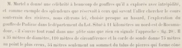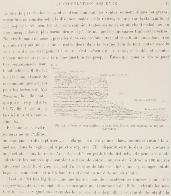 Dans Gallica, j’ai trouvé le livre de Stanislas Meunier qui contient l’un des récits d’exploration et résume les connaissances d’alors (1898) surtout vu du côté des résurgences. De nos jours, s’il existe une communication de l’eau vers les sources de Gintrac, il est bien connu que c’est la fontaine Saint-George, située au-dessous du village de Montvalent qui constitue la résurgence principale. Montvalent est aussi une commune (paroisse plutôt) très liée à l’histoire de mes ancêtres.