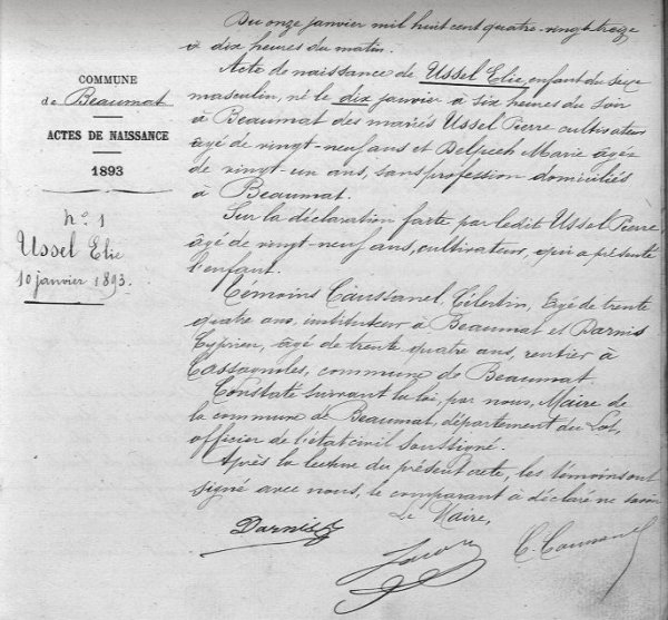 Elie USSEL est né le 10 janvier 1893 à Beauat près de Labastide-Murant dans le Lot. Il est le fils de Pierre Ussel et de Marie Delpech. Au conseil de révision, il est cultivateur à Beaumat.