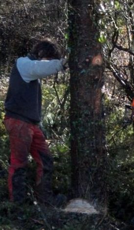 Nous avons choisi la large haie plutôt touffue qui séparait le haut du pré du chemin d’accès. Pour notre construction, nous devions abattre trois ou quatre jeunes arbres dont le tronc avait environ une douzaine de centimètres de diamètre. Plutôt petits donc. A tour de rôle, mes camarades se sont emparés de l’unique hache dont nous disposions (la mienne en fait) : une petite hache au manche assez court, très maniable pour le nettoyage des haies ou des branches d’un arbre abattue mais pas très adaptée pour l’abattage. Laborieusement, ils ont entrepris le travail imitant les gestes aperçus sur des photos sans doute. Sous leurs coups, la lame entrait à peine, écorchant le tronc de fins copeaux. Bien sûr, dans leur esprit, ce fut tout de suite la faute de la hache inadaptée à cette tache ! Lorsque vint mon tour, je frappais deux fois et j’avais fait une entaille atteignant déjà le cœur du tronc. Après le troisième coup, il nous a suffi de tirer un peu sur le tronc, du haut de notre taille, pour faire chuter l’arbre.