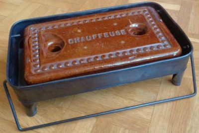 Une fois chauffées sur le poë le, dans la cuisinière ou la cheminée, elles étaient "emmaillotées" d’un linge et mise dans le lit pour le réchauffer d’abord puis pour y appuyer les pieds ensuite quand on se couchait. Ce type de brique était quelquefois accompagné d’un support en métal (voir ci-dessous) permettant de la faire chauffer et/ou de la transporter une fois chaude.