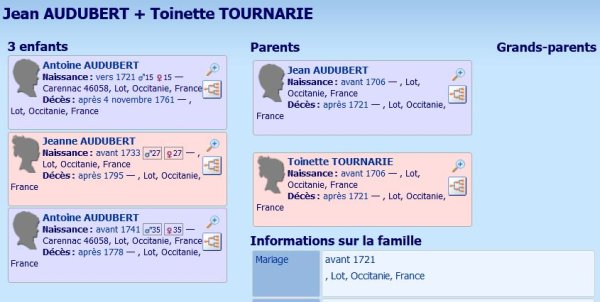 Depuis que l’arbre approche les vingt mille personnes répertoriées, une vérification d’une éventuelle existence des fiches individuelles ou familiales déjà saisies s’impose afin de ne pas créer des doublons (la fusion de deux fiches est toujours risquée même si webtrees, mon logiciel, est plutôt précautionneux et efficace). Et... bingo ! Les parents de Julien, AUDUBERT Antoine et MAURY Marguerite (