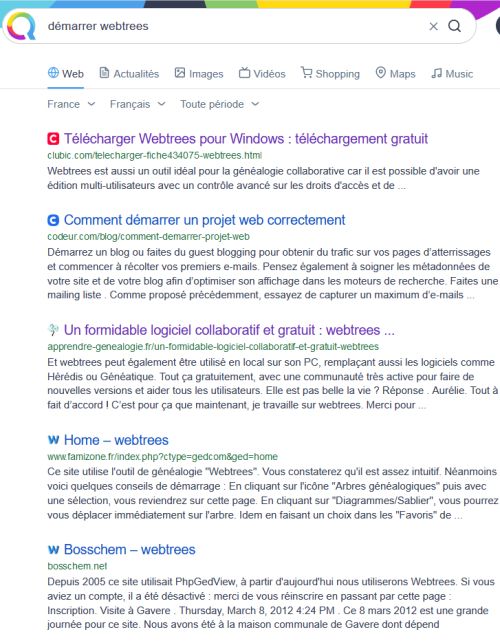 ! Tiens donc, webtrees.net n’apparaît pas ! A tout hasard, le champ de recherche de Qwant est renseigné avec "webtrees démarrer" et, surprise, webtrees.net est en tête. Ouf !