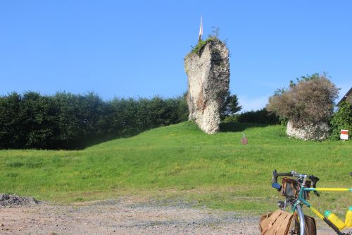 Nous partons à vélo vers Blangy où, près des ruines du château, nous découvrons un parking sur lequel nous aurions pu nous installer au coeur du village. D’ailleurs une voisine de ce lieu nous confirme qu’il y a bien un projet d’aménager quelques places pour le stationnement court des camping-cars qui sont de plus en plus nombreux.