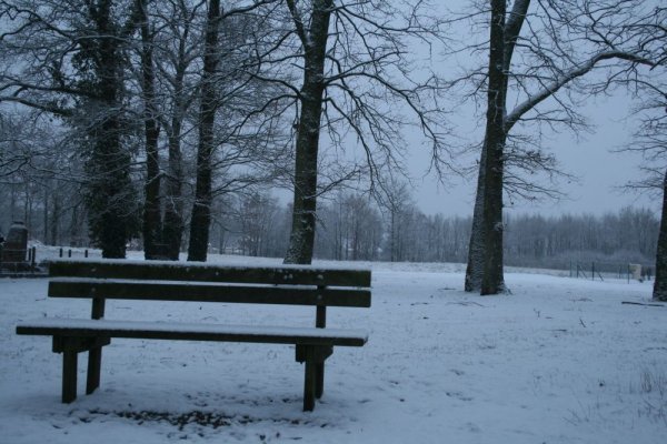 Toutes les photos ont une histoire : Dans le jardin public derrière la maison, il y a un banc public, un seul. Les parents s’y installent pendant que leurs jeunes enfants jouent à la balançoire ou au toboggan. Les adolescents y posent leurs sacs et leurs blousons quand ils viennent discuter sans fin et refaire le monde à leur image. La plupart du temps, il est vide et attend d’hypothétiques utilisateurs. Avec la neige plutôt rare depuis quelques années, il se repose et n’a pour visiteurs que le rouge-gorge du jardin qui se perche sur le dossier à la recherche d’un endroit déneigé pour y trouver une maigre subsistance.