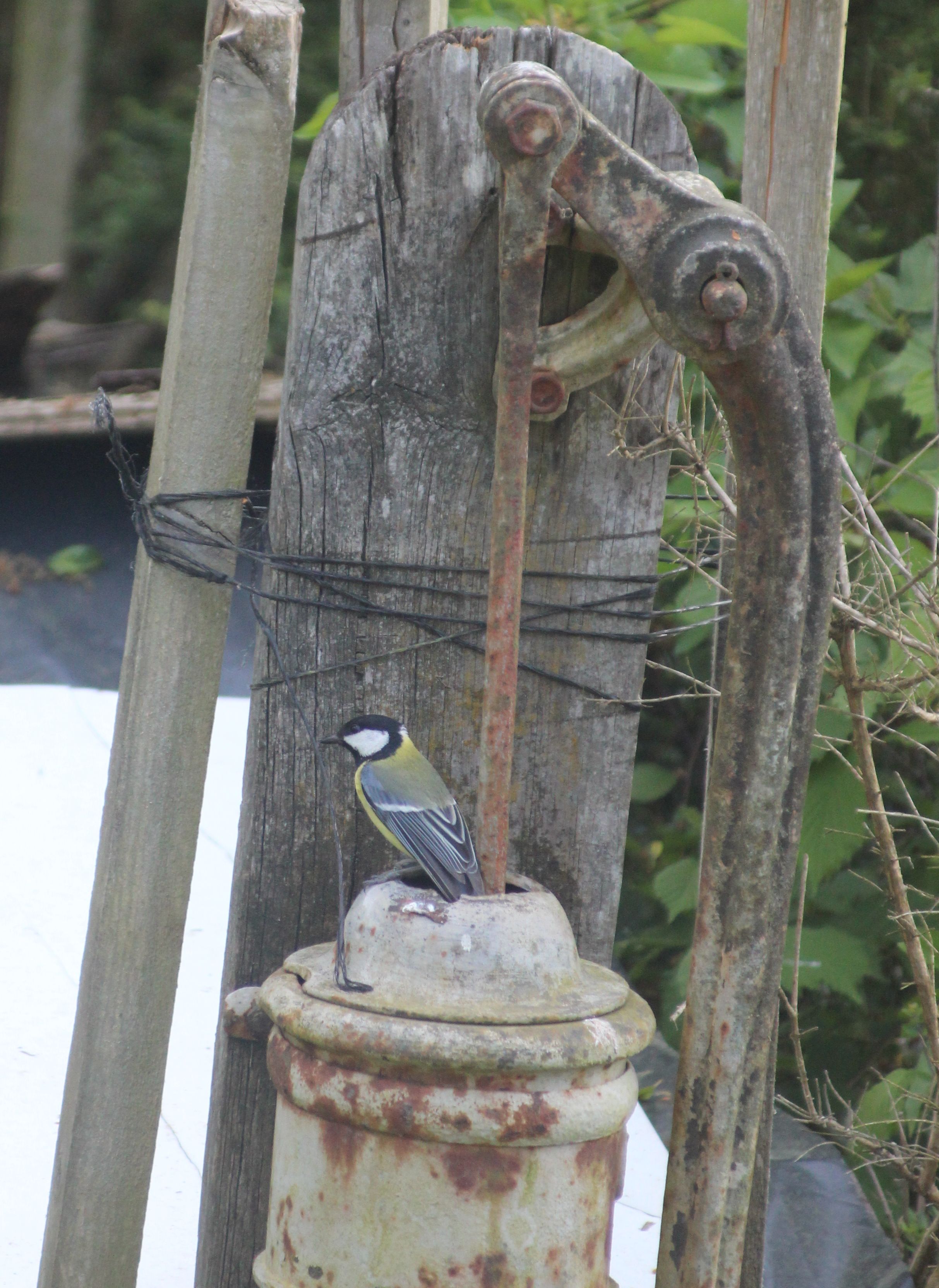 Toutes les photos ont une histoire : Cette mésange semble vouloir cacher qu’elle a niché dans le corps de la pompe auxquelles elle accède par le trou du bras de pompage. Elle ne sait pas qu’elle ne fait que reproduire ce que faisaient ses congénères quand cette pompe était dans le jardin de Pépère et Mémère à Saint-Firmin-des-Prés.