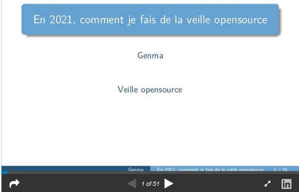 Dans le cadre professionnel, j’ai été amené à faire une séance de formation / présentation à mes collègues de "comment je fais de la veille opensource". J’ai repris sous la forme d’une présentation des éléments que l’on peut trouver éparpiller dans mes billets de blogs écrit au fil des années. La présentation n’a pas été filmée, le support a été modifié / adapté pour une libre diffusion en ligne. Je le mets à disposition ici en visionnage, si cela peut être utile à d’autres personnes.