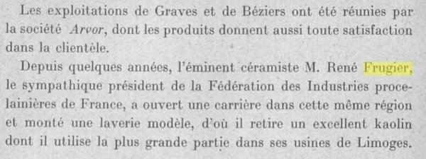 Réné Frugier était un entrepreneur insatiable. Il voulait maitriser toute la chaine de production de sa porcelaine. Pour cela il a acheté des carrières de kaolin dans les Cotes d’Armor et dans la région de Béziers.