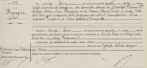 René FRUGIER décède le 11 fevrier 1944 à 85 ans. On notera que l’acte de décès utilise son prénom officiel « Gilbert » et non le prénon usuel « René » :