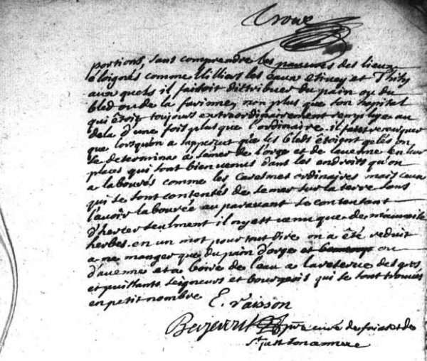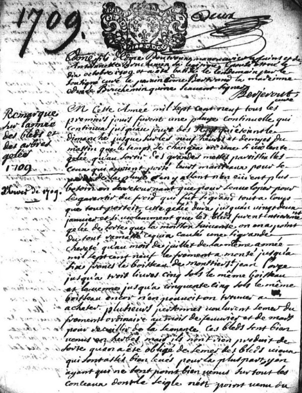 En cette année mil sept cent neuf, tous les premiers jours furent une pluye continuelle qui continua jusqu’au jour des roys qui étoient le dimanche jusque sur les neuf heures et demyes du mattin, que le temps se changea en une si violente gelée qu’au sortir des grandes messes paroissialles, ceux qui avoient porté leurs manteaux pour de la pluye en y allant n’en eurent plus besoin en s’en retournant que pour s’enveloper pour se garantir du froid qui fût si grand tout a coups que tout portoit. Cette gelée dura jusqu’au vingt deux janvier et si violemment que les bleds furent entierement gelée de sorte que la moisson suivante, on en a point du tout ramassé, ce qui a causé une si grande chereté qu’au mois de juillet de la même année mil sept cent neuf le froment a monté jusqu’à six francs le boisseau de Moutiers-Saint-Jean, l’orge jusqu’à trois livres cinq sols le même boisseau et l’avenne jusqu’a cinquante cinq sols le même boisseau, encor n’en pouvoit on trouver à acheter. Plusieurs personnes voulurent semer du froment ordinaire au mois de feuvrier et de mars pour recueillir de la semence. Ces bleds sont bien venus en herbes mais ils n’ont rien produit, de sorte qu’on a été obligé de semer des bleds vieux qui sont assés bien levés pour la pluspart, y en ayant qui ne sont pas bien venus surtout les conleaux ( ?) dont le seigle n’est point venu du tout mais seulement le froment y étoit. Tous les noyers ont été tellement gelés qu’ils sont tous morts, à la réserve de quelque jeunnes d’environ huit a dix et quinze ans qui paroissent pour la pluspart n’estre pas entierement morts. Les poiriers, pruniers et une grande quantité de pommiers entierement morts, les vignes entierement gelée en sorte qu’il les falu couper par le pied, comme on a arraché les noyers, poiriers, pruniers et la plus grande partye des pommiers. Cette gelée qui fût suivie de deux autres qui durerent chacune huit jours et dont la derniere commença le lundy avant le jour onzieme mars ont tellement endomagé touts les biens de la terre qu’on a recuilly ny bleds ny vin, ny noix ny poires, ny pommes, ny glans, ny fainne, ny aucuns fruits que ce soit, sinon quelques pommes par cy par la qui ne vaut pas la peinne d’en parler. La provence et le languedocque ont produit quelque peu de vin, comme la Bretagne un peu de bled. Il est mort beaucoup de monde ... mort par nécessité et sur tout dans les pays de vingnoble. La moisson arrivée, tout le monde presque a été réduit au pain d’orge et beaucoup a celuy d’avene pure, jusqu’a la maison de monsieur l’abbé de Chandenier abbé de Moutier-Saint-Jean ou on a été réduit a mettre moytié orge et moytié bled a la réserve du pain qu’on faisoit pour luy seul quoy que ce soit une maison bien économisé et ou il n’y a aucune prodigalité que les abondantes charités de ce sr abbé qui a distribué trois jours de chaque semaines des mois de may, juin, juillet de la souppe aux pauvres des villages des environs de Moustier-Saint-Jean, dépendantes de la dite abbaye, une portion a chaque pauvre, la portion faisant une grande écuellée et demye. Le nombre des pauvres étoit si grand que chaque distribution par jour montoit jusqu’a sept cent cinquente portions, sans comprendre les pauvres des lieux éloignés comme Villiers les eaux, ....., et Thisy aux quels il faisoit distribuer du pain ou du bled ou de la farinne, non plus que son hôpital qui êtoit toujours extraordinairement employé au dela d’une fois plus que l’ordinaire. Il faut remarquer que lorsqu’on a apperçut que les bleds êtoient gelés on se détermina a semer de l’orge et de l’avenne en leur places qui sont bien venus dans les endroits qu’on a labourés comme les caresmes ordinaires, mais ceux qui se sont contentés de semer sur la terre sans l’avoir labourée auparavant, se contentant d’hercer seulment, il n’y est venu que des mauvaises herbes. En un mot, pour tout dire, on a été réduit a ne manger que du pain d’orge ou d’avenne et a boire de l’eau, à la réserve des gros et puissants seigneurs et bourgeois qui se sont trouvés en petit nombre.