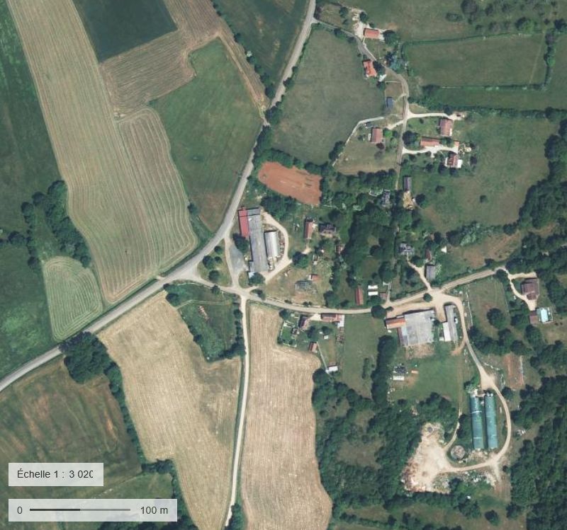 - deux maisons d’habitations juste au-dessous du groupe de construction en haut de la photo, une de chaque côté de la route,