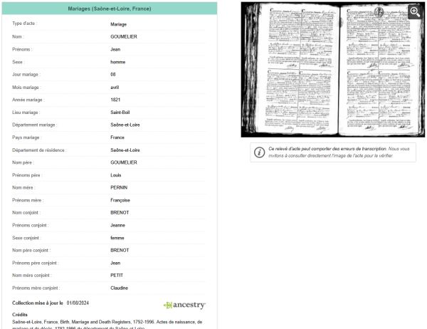 - Certains n’ont pas manqué de me rappeler que je n’ai pas pris en compte le lien d’informations, sous l’image. Ce lien affiche : "Ce relevé d’acte peut comporter des erreurs de transcription. Nous vous invitons à consulter directement l’image de l’acte pour le vérifier." Mais si, justement, et c’est ainsi que j’ai pu rédiger cette page.