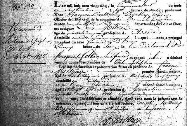 Cécile Joséphine MÉTRAU est née le 4 septembre 1825 à 14h à Nouan-le-Fuzelier (Loir-et-Cher). Sa naissance est déclarée le lendemain à Jacques Barthélémy DARBLAY, maire de la commune, par Louis METRAU, charron, son père.
