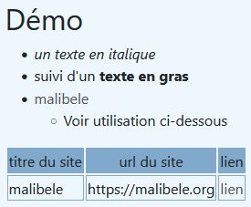 Démo - * *un texte en italique* * suivi d'un **texte en gras** * [malibele](https://malibele.org) * Voir utilisation ci-dessous | titre du site | url du site | lien | |----|----|----| | malibele | https://malibele.org|[lien](https://malibele.org) |affiche :