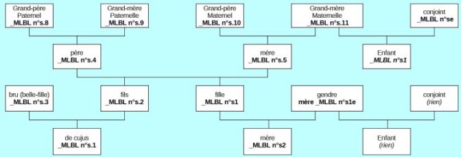 - "s1e" pour les conjoints d’un "s1". Exemple "_MLBL n°s1e" signifie que le conjoint est frère ou sœur d’un ancêtre direct.